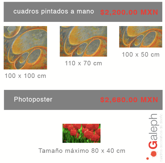En Galeph, sólo tenemos dos únicos precios. Uno para cuadros pintados a mano, si la medida no excede 110 cm (1 metro con 10 cm) de lado, y otro, un precio único exclusivo para tu proyecto, también exclusivo.